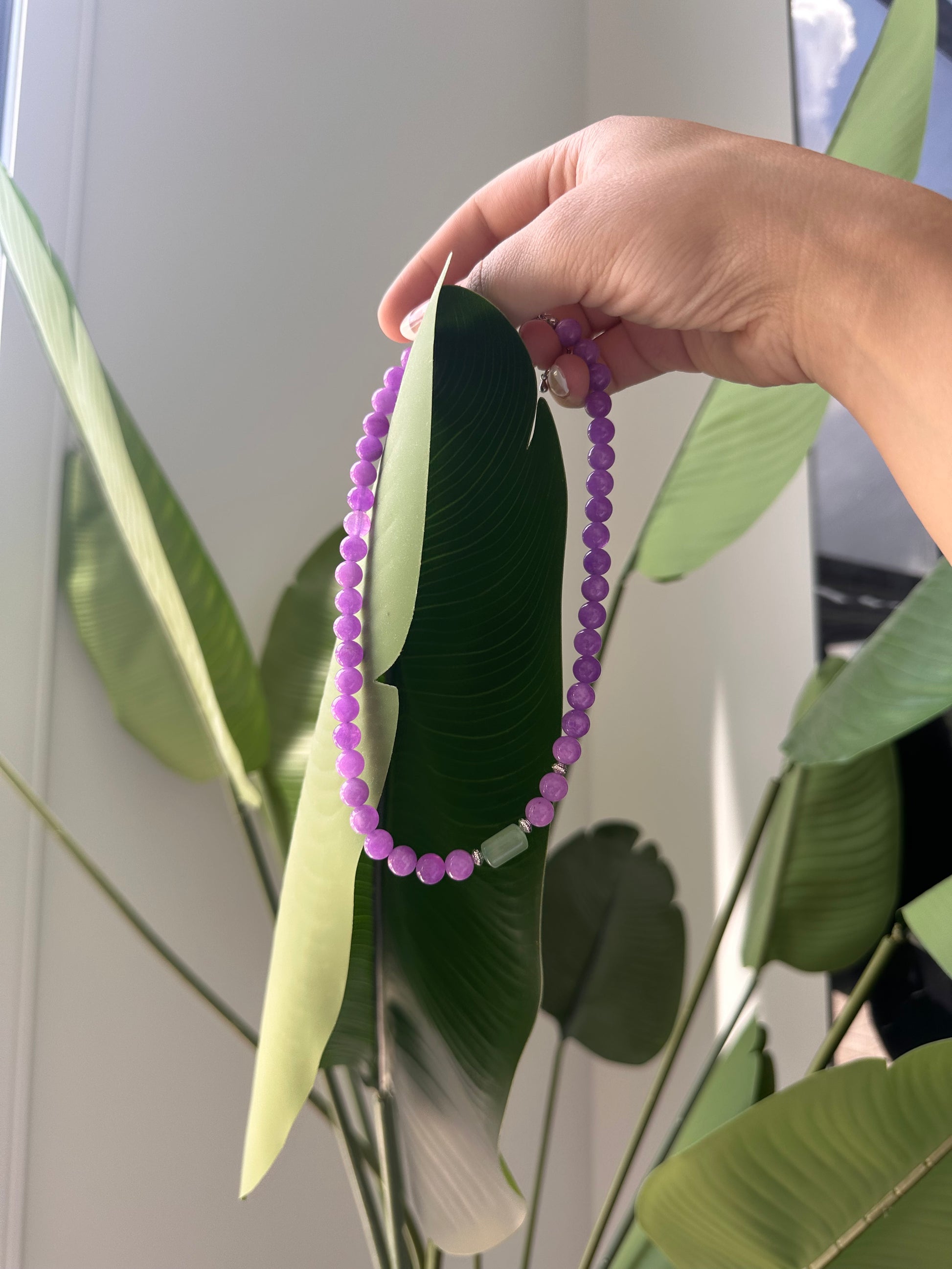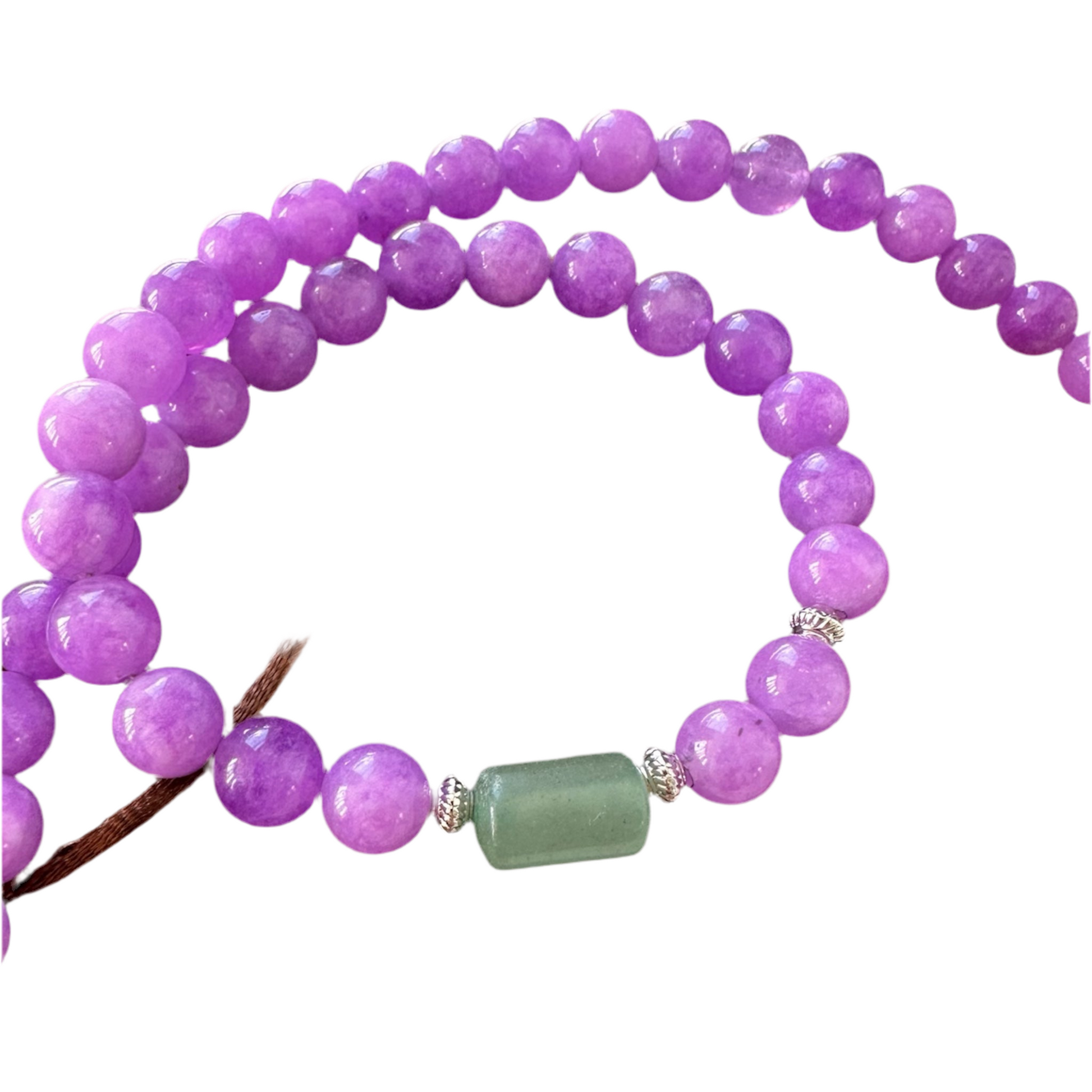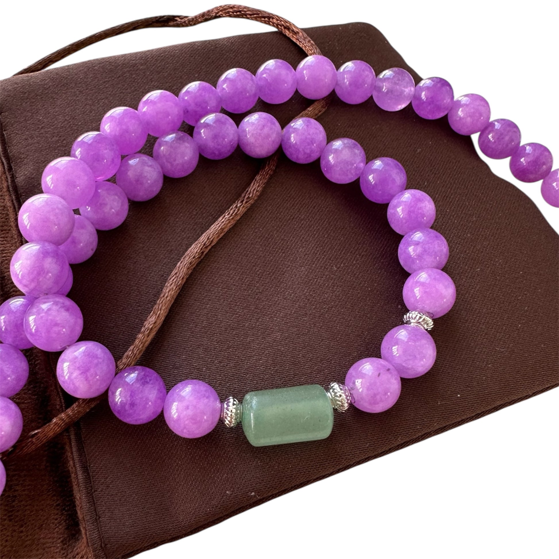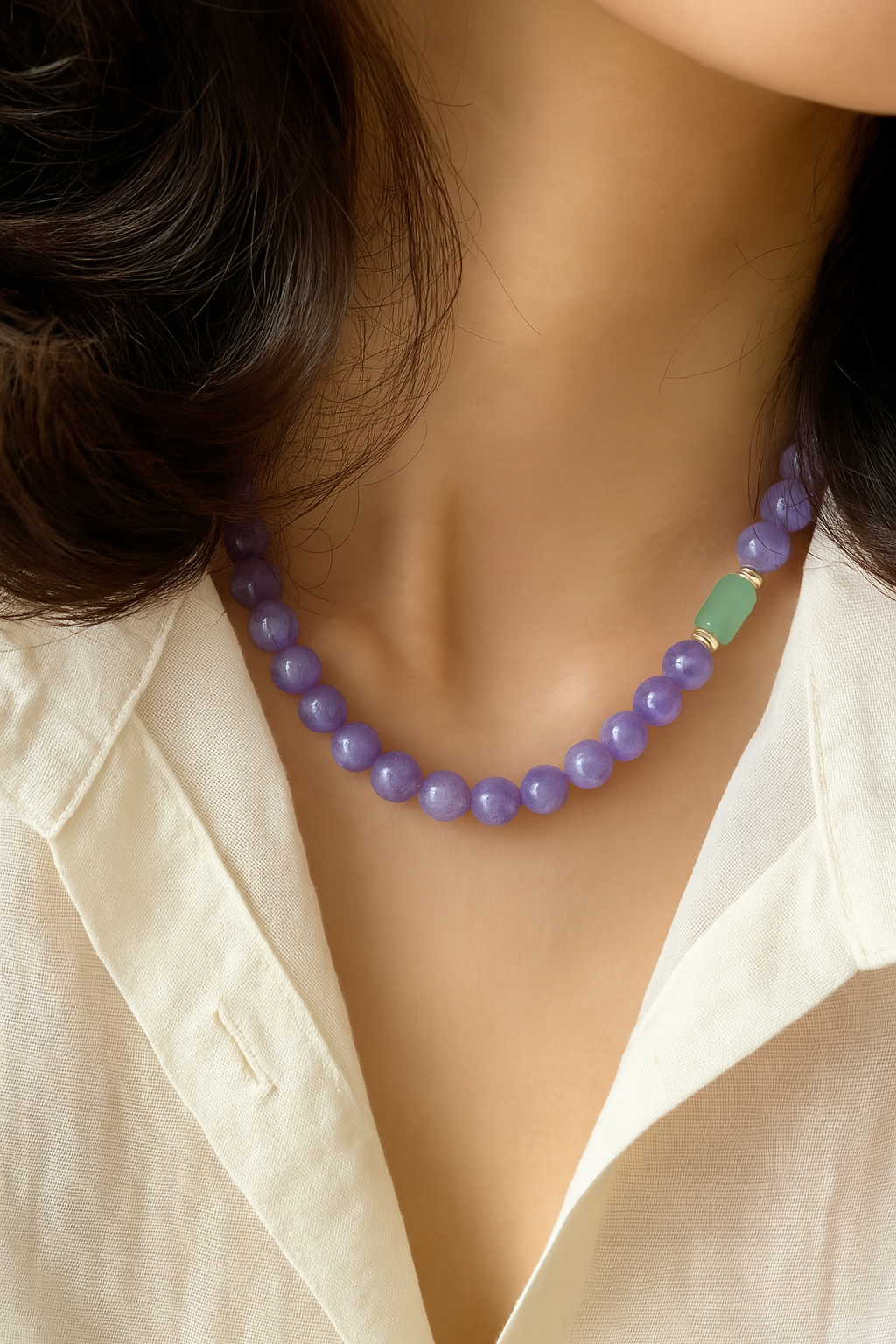 Discover the calming beauty of the Amara Necklace, crafted from smooth, round Purple Jade beads accented with a touch of soft green jade. Known for its soothing energy and elegant appearance, Purple Jade is believed to bring harmony and spiritual balance. This delicate necklace adds a subtle pop of color and natural elegance to any outfit — perfect for everyday wear or special occasions.