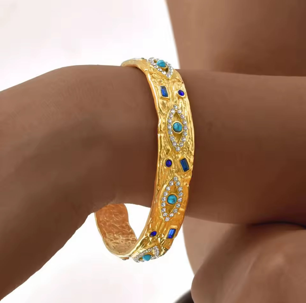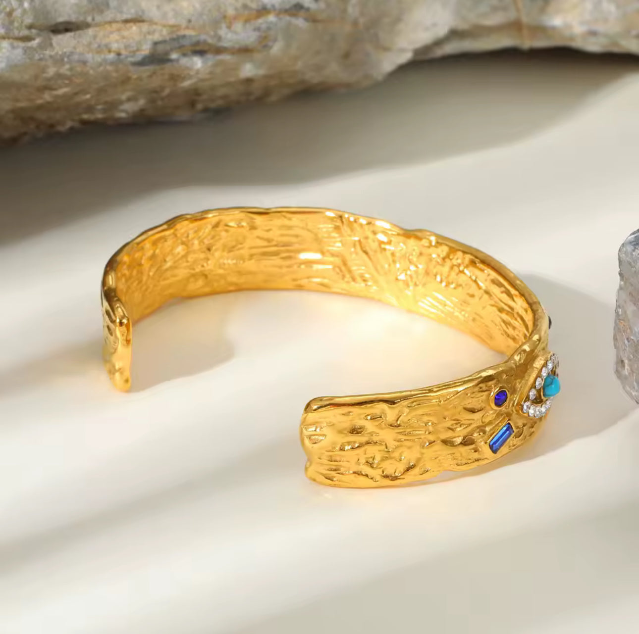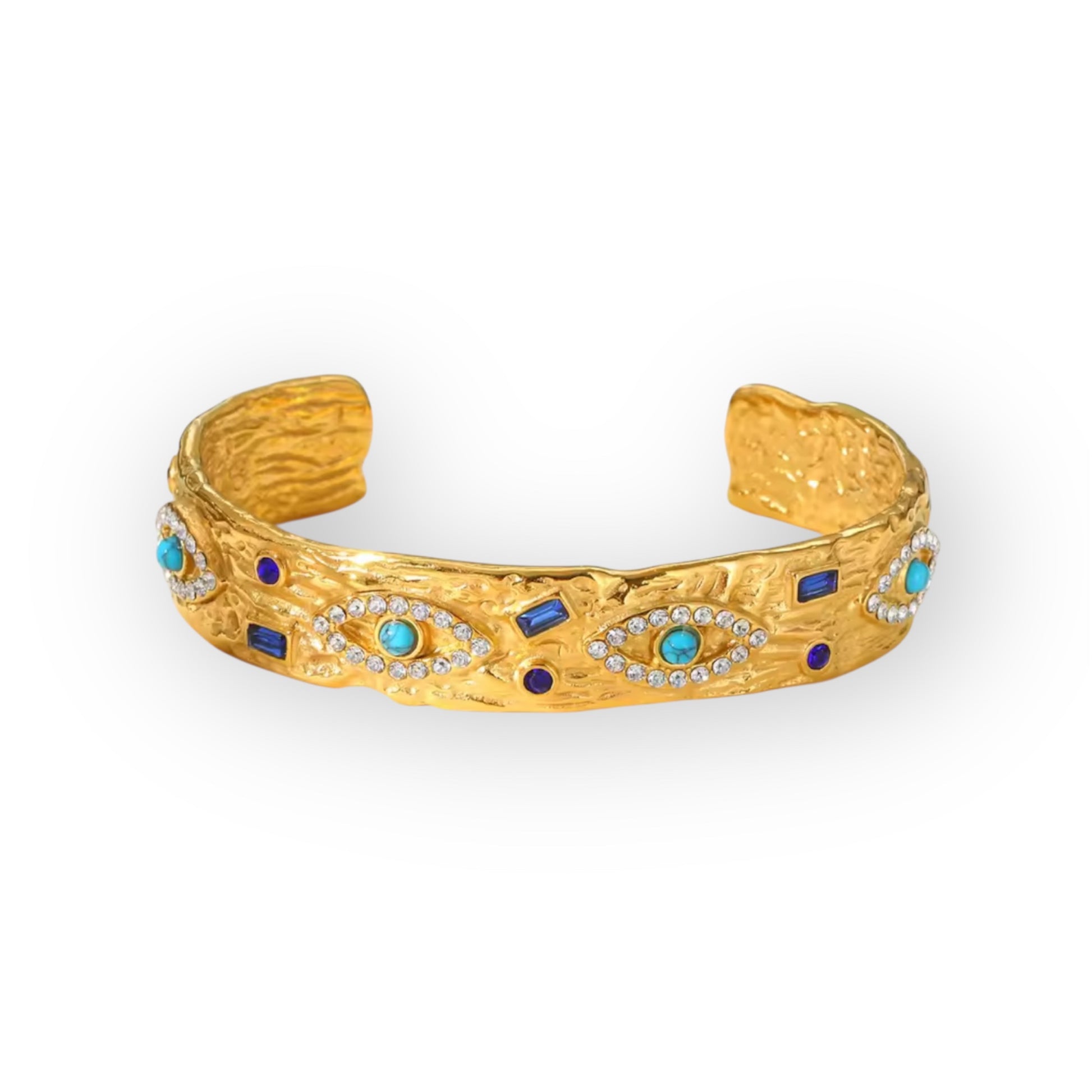 Bold yet mystical, Aurelya is a gold-plated cuff bracelet adorned with turquoise stones and symbolic evil eye motifs. Crafted from hypoallergenic stainless steel, its textured finish and radiant gems make it a powerful statement of protection and style.