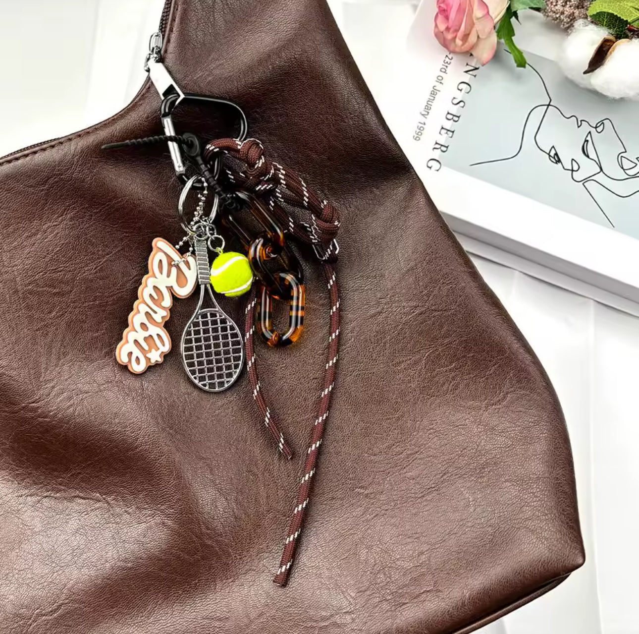 Serve up some personality with this sporty-chic bag charm set. Featuring a playful tennis ball, detailed racket charm, trendy “barbie” script, and tortoiseshell-style link, this accessory brings a fun and stylish twist to any handbag or backpack. Made from durable rope, alloy, and plastic materials, it’s lightweight, easy to clip on, and perfect for tennis lovers or anyone who wants to add a pop of charm to their daily look.