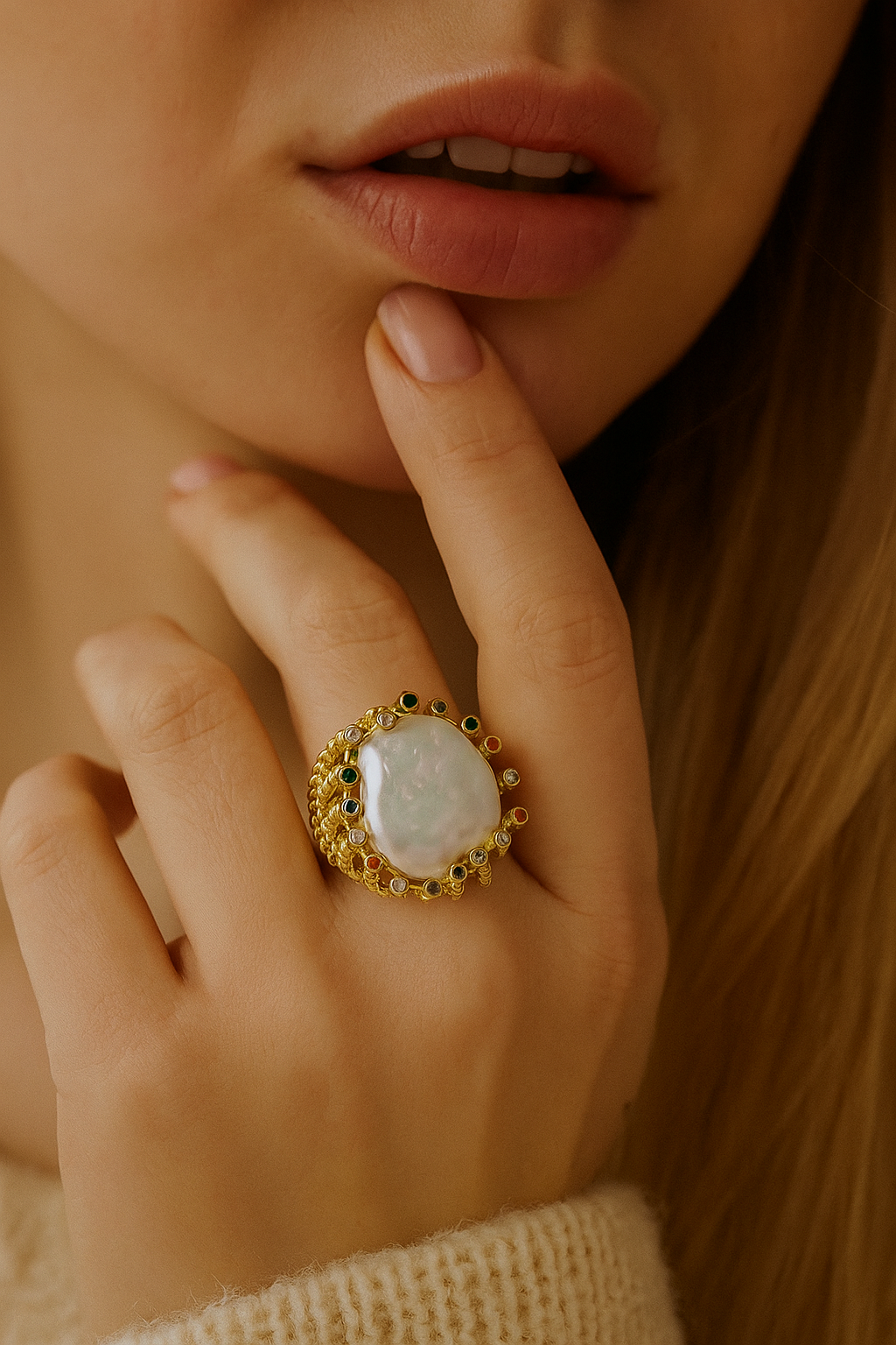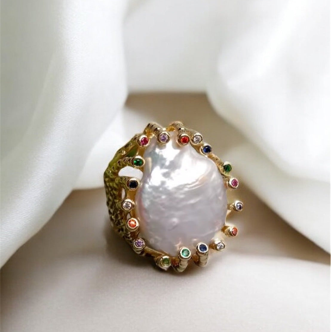 Turn heads with the timeless beauty of this handcrafted 26mm white coin pearl ring, set in a crown of multicolored CZ pavé gemstones. Its bold, baroque-style design is balanced by the delicate shimmer of genuine freshwater pearl, making it a standout piece for every occasion.