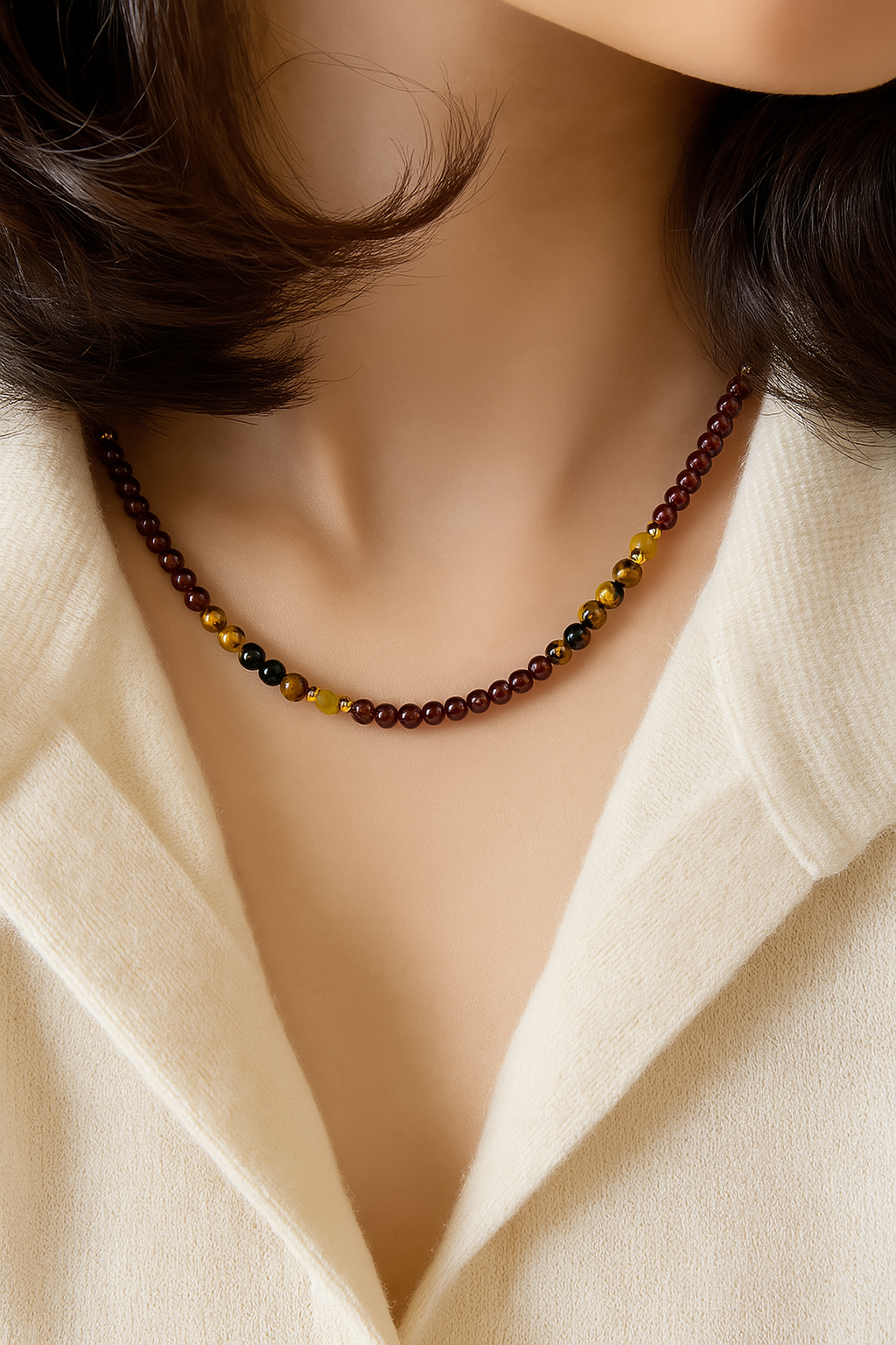 A bold fusion of natural Tiger Eye and Garnet beads, this striking necklace captures the essence of fiery strength and grounding energy. The deep, golden shimmer of Tiger Eye symbolizes courage and clarity, while Garnet is believed to inspire passion and vitality. Accented with gold-plated details, this necklace is the perfect statement of confidence and timeless charm, ideal for both everyday wear and special occasions.