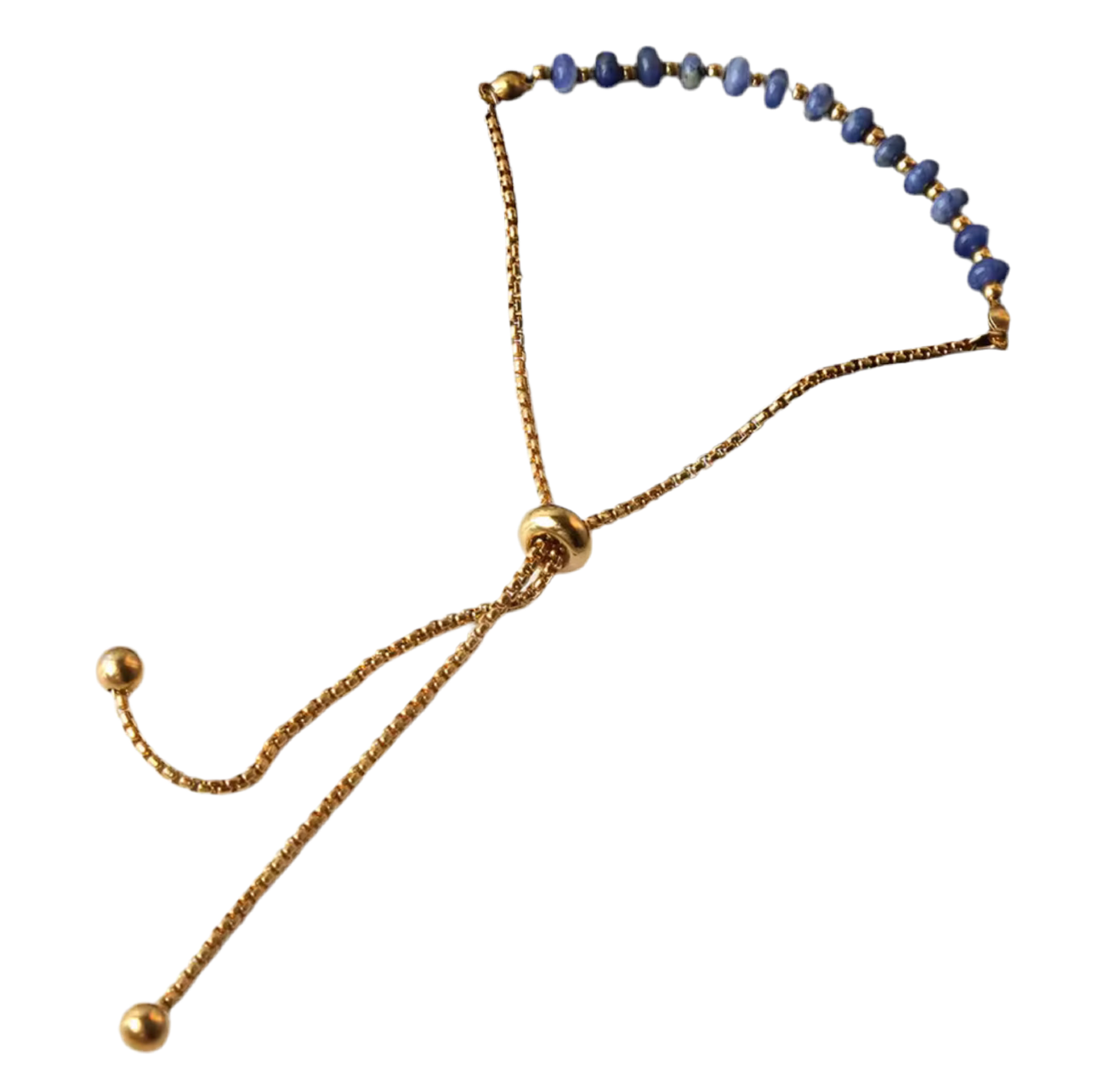 A delicate bracelet crafted with natural Lapis Lazuli stones, known for their rich indigo-blue hue and timeless beauty. Lapis Lazuli has long been cherished for promoting wisdom, confidence, and inner peace. The stones are paired with a sleek, adjustable gold-plated chain, making this bracelet as meaningful as it is elegant — perfect for daily wear or gifting.