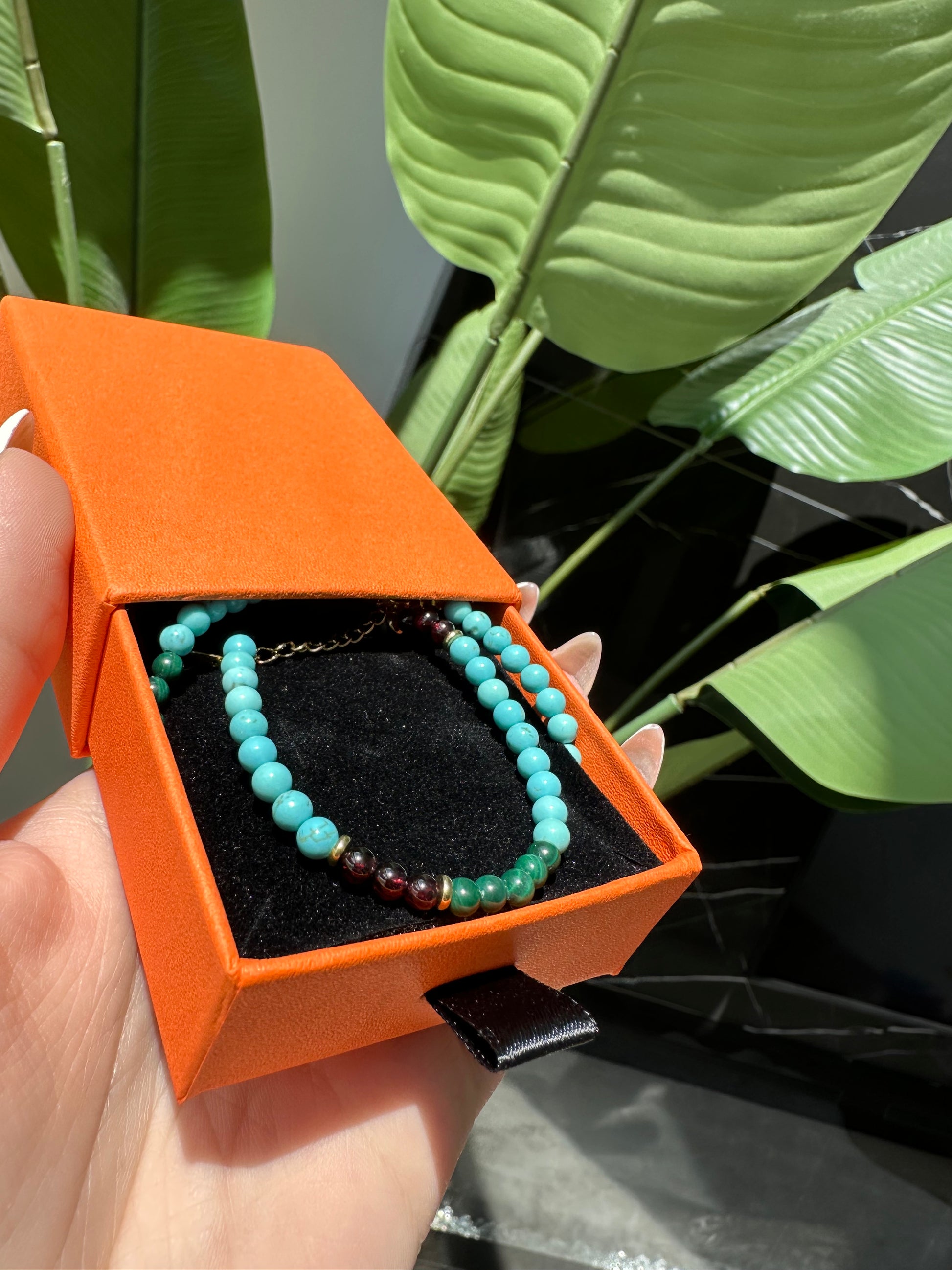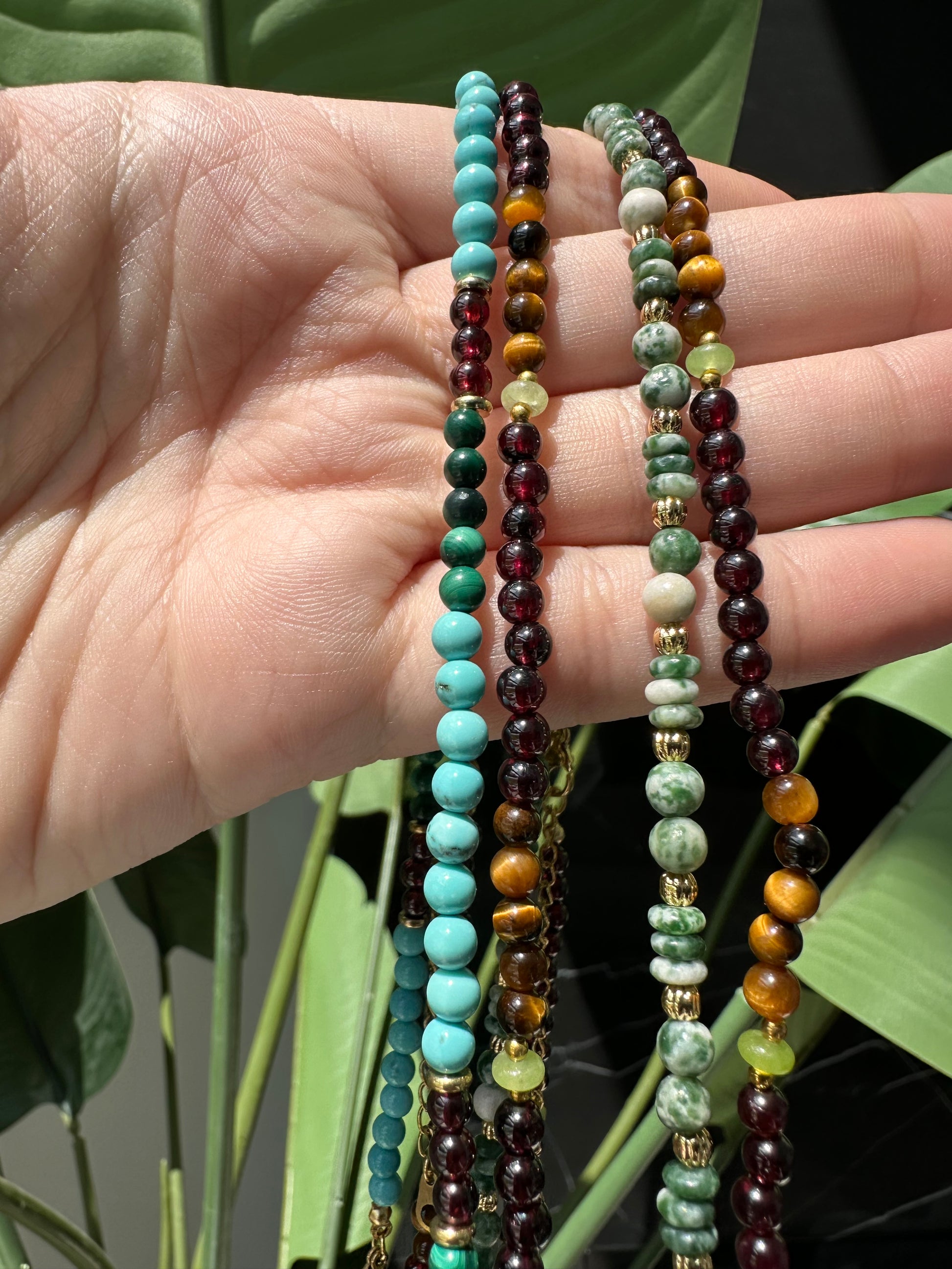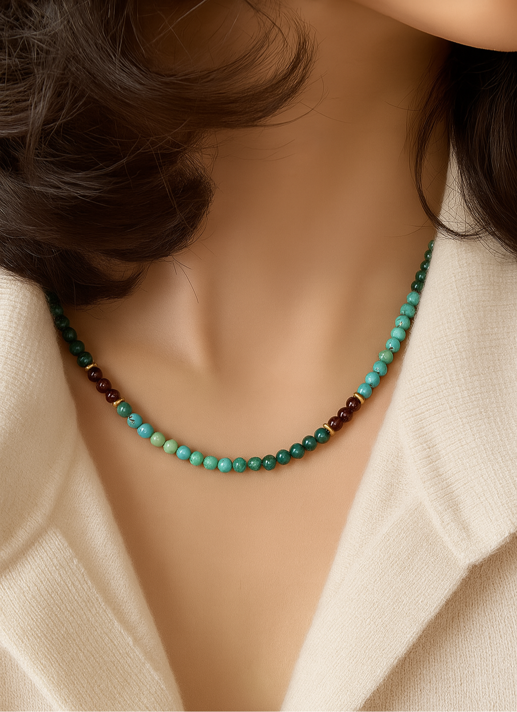 A captivating mix of natural Turquoise and Malachite beads, this delicate necklace evokes the refreshing beauty of coastal waters and lush forests. Turquoise is known as a symbol of protection and positivity, while Malachite is believed to bring transformation and emotional balance. Finished with subtle gold-plated accents, this necklace effortlessly blends earthy elegance with everyday wearability. Perfect for stacking or wearing solo for a touch of nature-inspired charm.