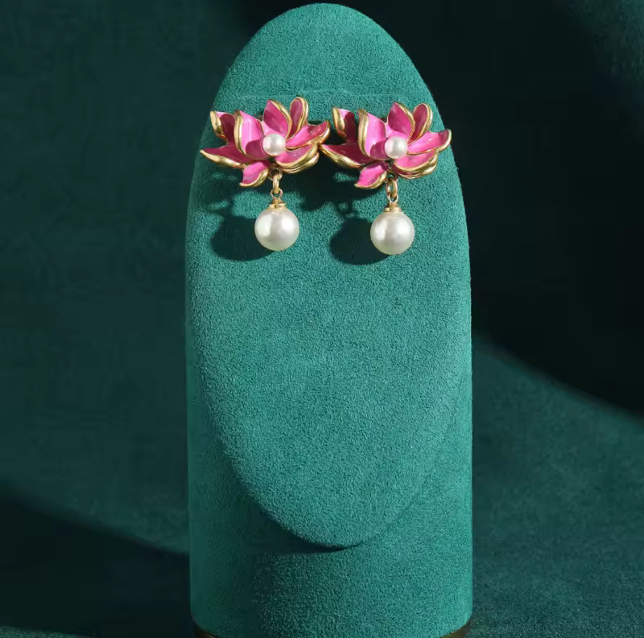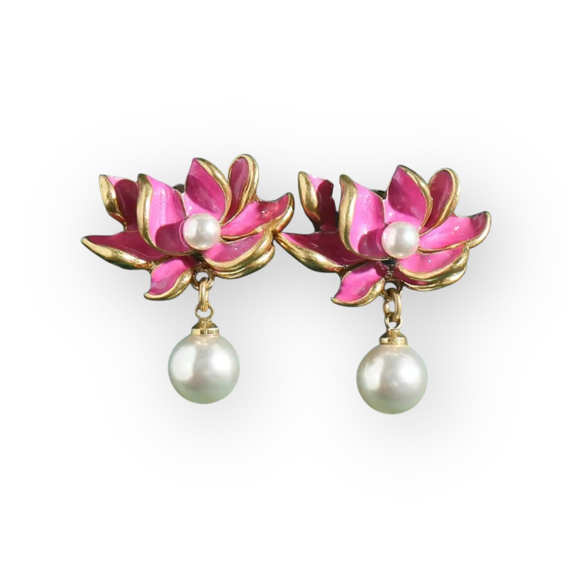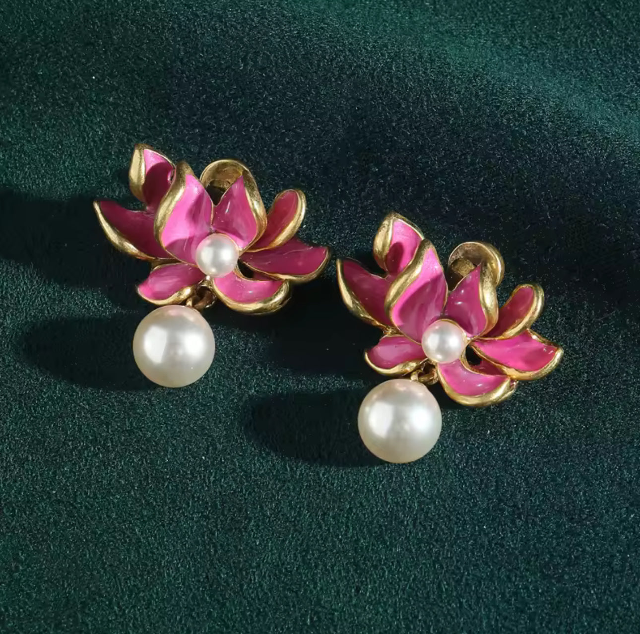 Graceful and symbolic, Lotus earrings bloom with hand-painted pink petals and are finished with a classic pearl drop. Inspired by beauty, renewal, and feminine power — this vintage-inspired design adds a soft yet striking touch to your look.