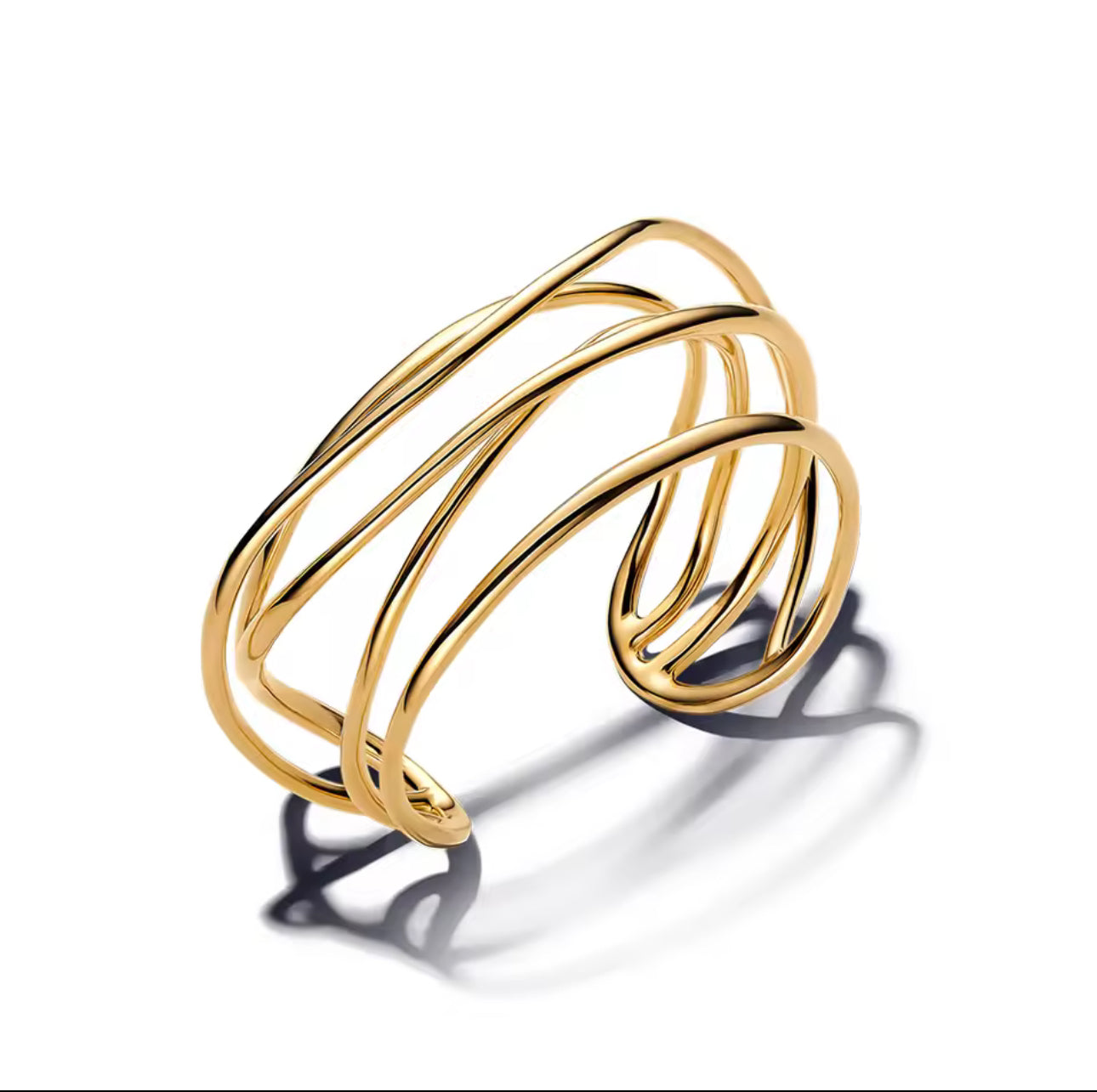 Gold-plated 925 silver bracelet, beautifully crafted from sterling silver and coated with a rich golden sheen. Its smooth, intertwined form captures light effortlessly, adding a touch of refined elegance to any outfit.