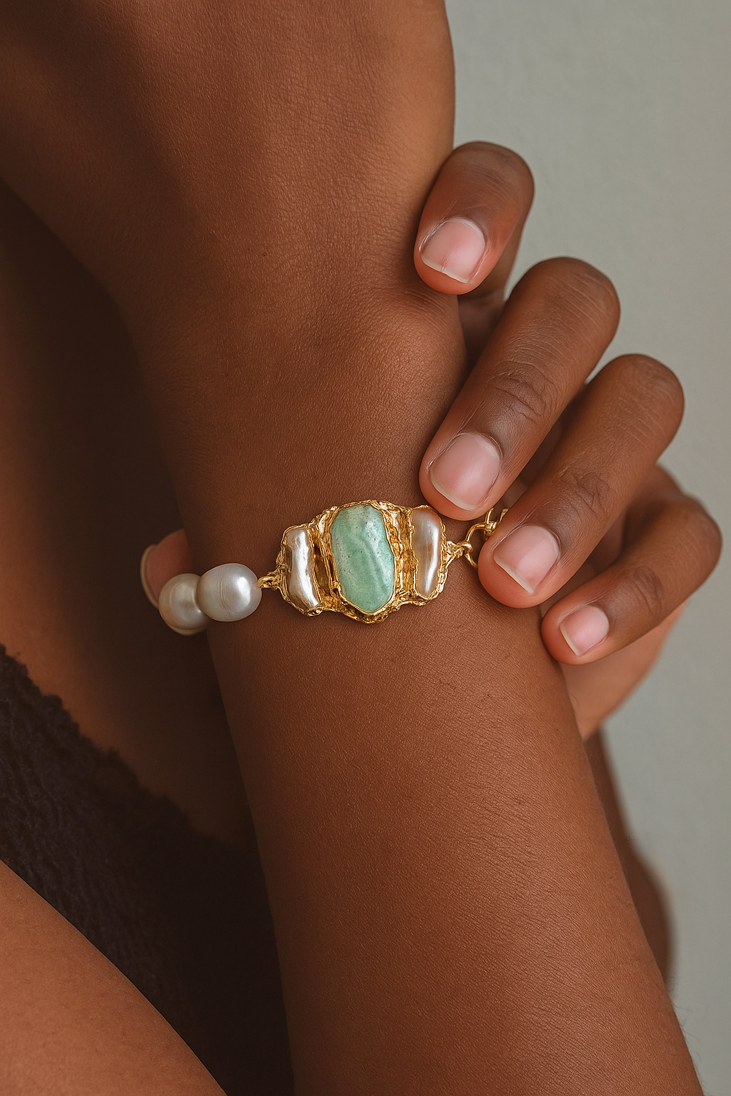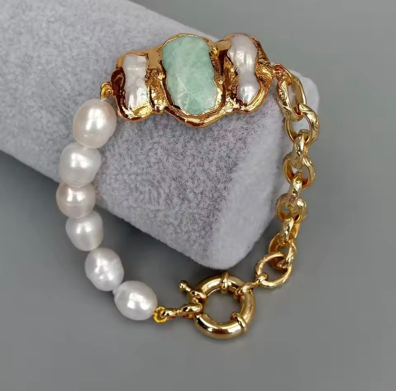 Where timeless elegance meets modern artistry. This exquisite bracelet is crafted with lustrous freshwater cultured pearls, delicate white rice pearls, and rare biwa pearls — each chosen for their organic beauty and radiant glow. At its heart, a hand-polished amazonite connector, embraced by rich 18K gold-plated detailing, adds a touch of serene sophistication.