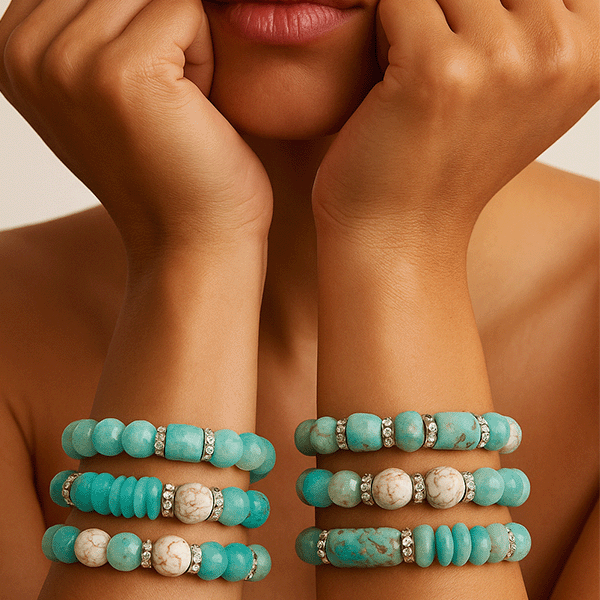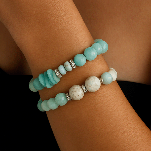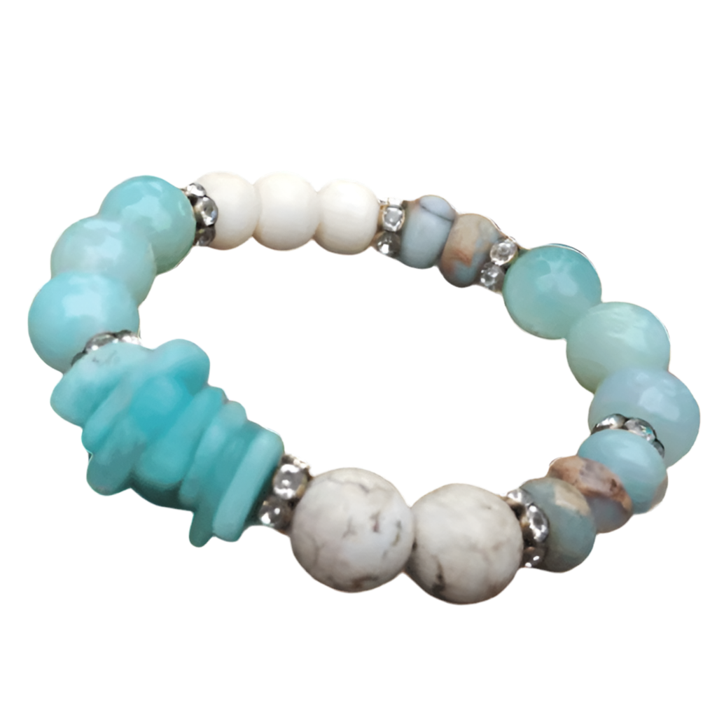 Channel calm, clarity, and grounded energy with the Ocean Spirit bracelet — a stunning combination of natural Amazonite, Howlite, and Opalite beads, accented with sparkling crystal spacers. The focal point is a stack of hand-cut turquoise chips, evoking the serene power of the sea.