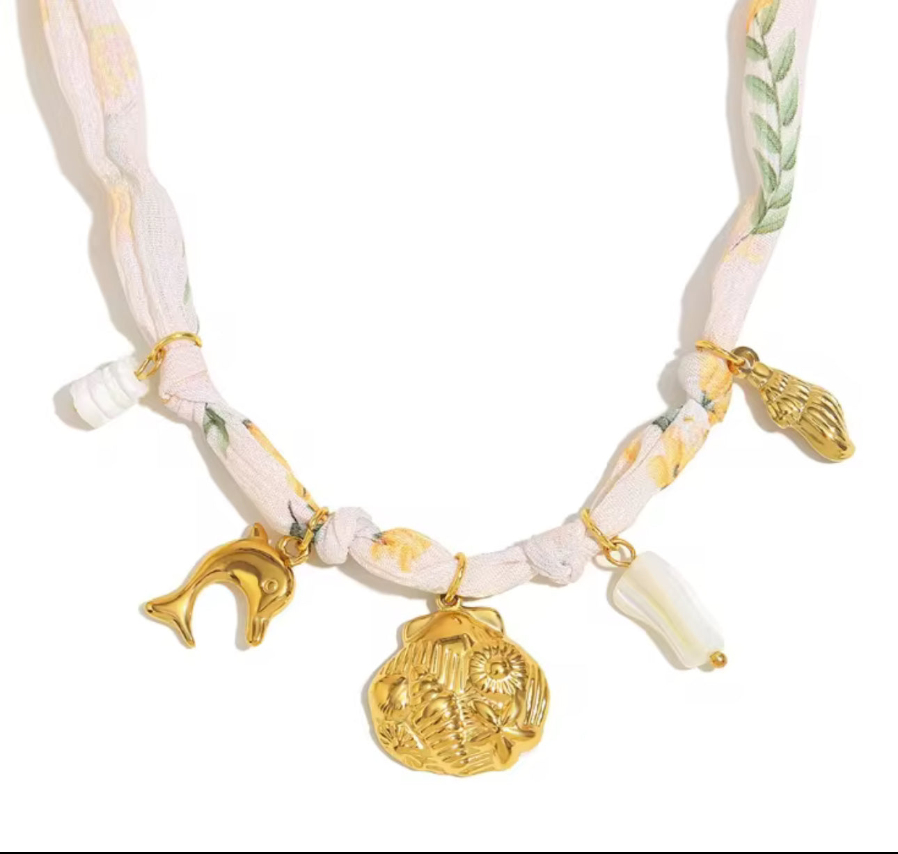 Drift into coastal elegance with our Seashell Dreams Necklace. Designed with a soft floral fabric band and adorned with golden stainless steel pendants — including a dolphin, seashell, and medallion — this piece captures the magic of seaside adventures. Crafted from high-quality stainless steel, the pendants are waterproof, tarnish-resistant, and made to shine season after season. Lightweight yet eye-catching, it’s the perfect accessory for summer outfits, beach getaways, or adding a touch of vacation spirit to your everyday style.