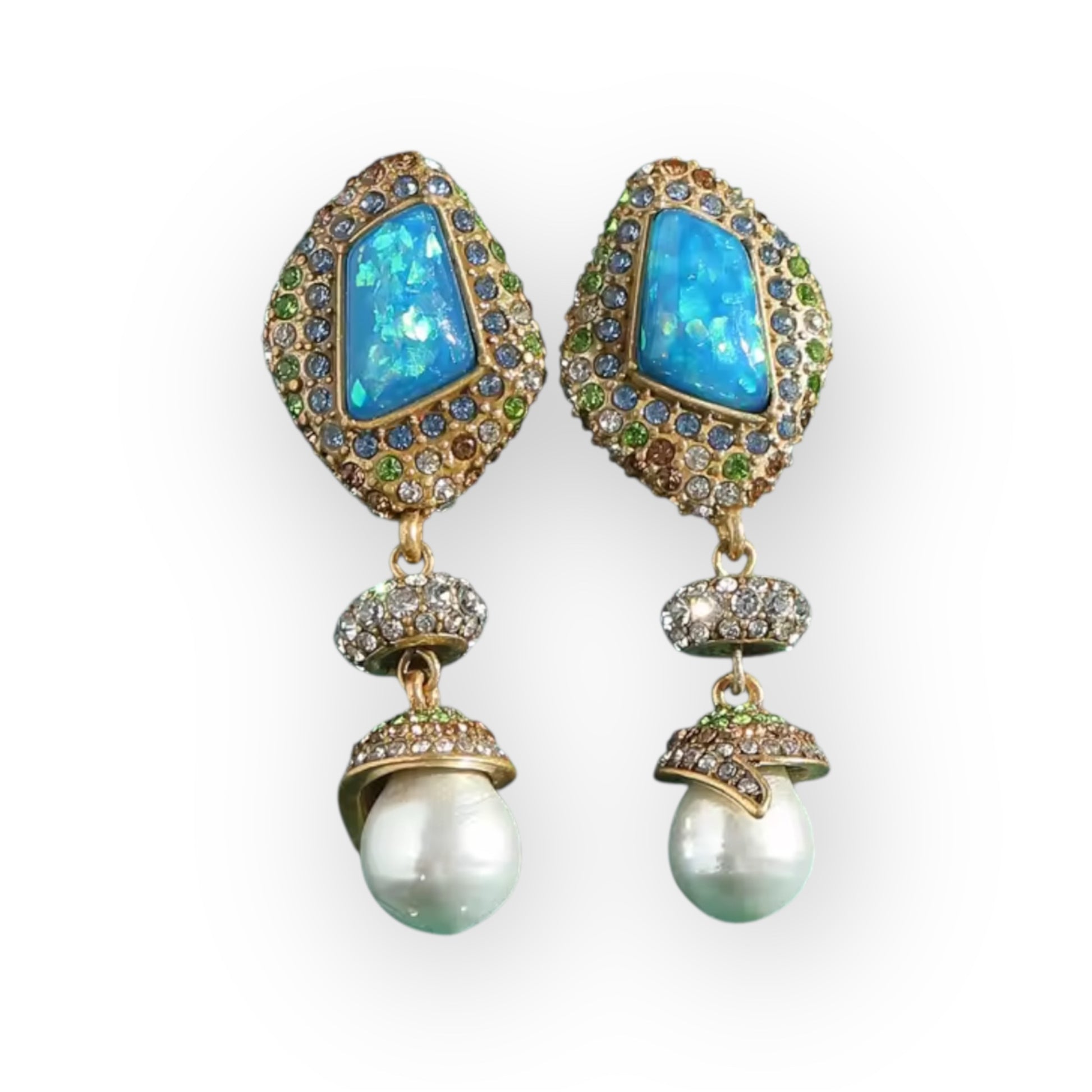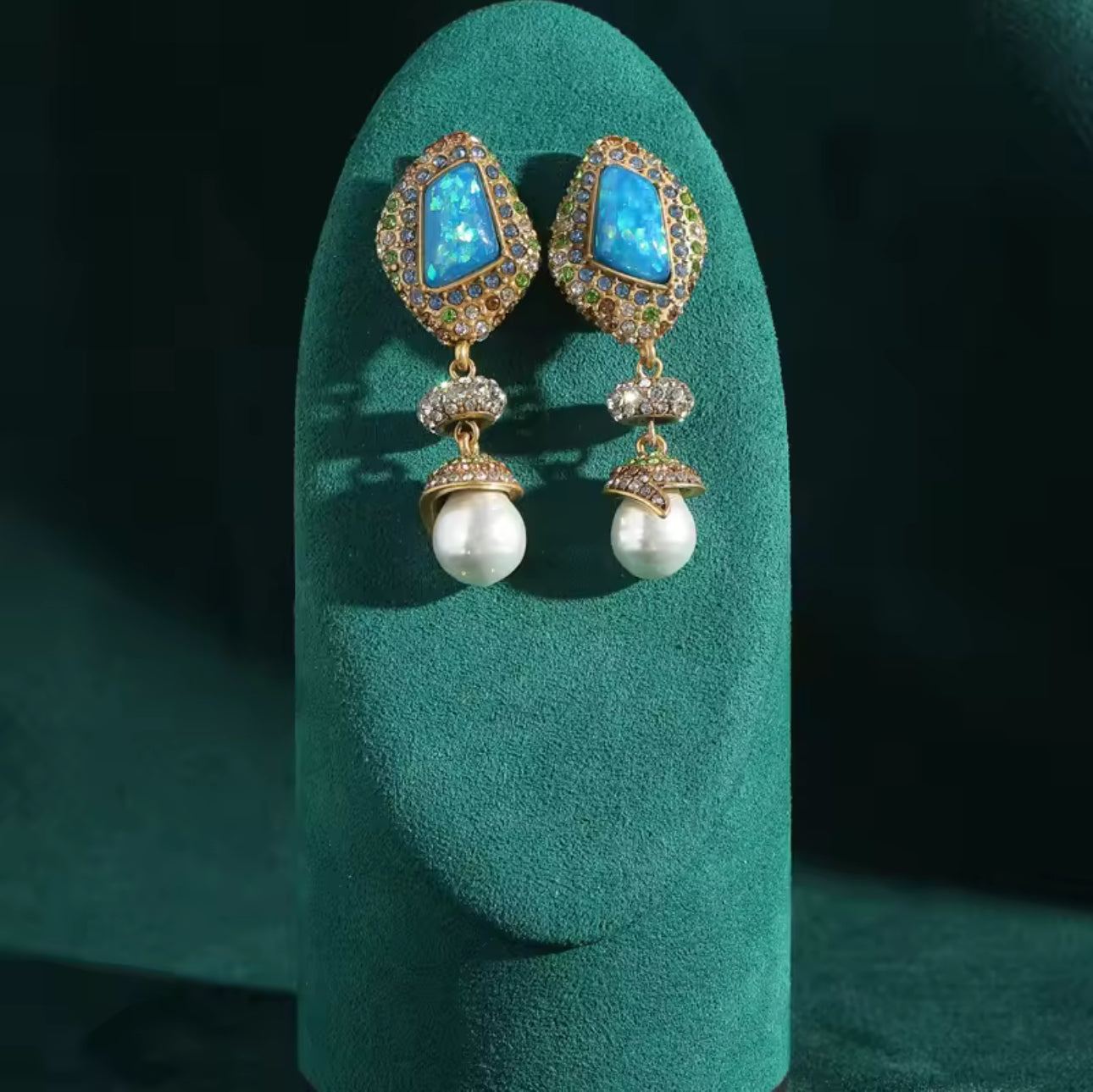 Channel timeless allure with Sirenia — earrings inspired by the mystique of ocean sirens. Featuring vibrant natural stone inlays, luminous pearl drops, and antique-style craftsmanship, all plated with genuine gold. A luxurious blend of vintage soul and modern elegance.